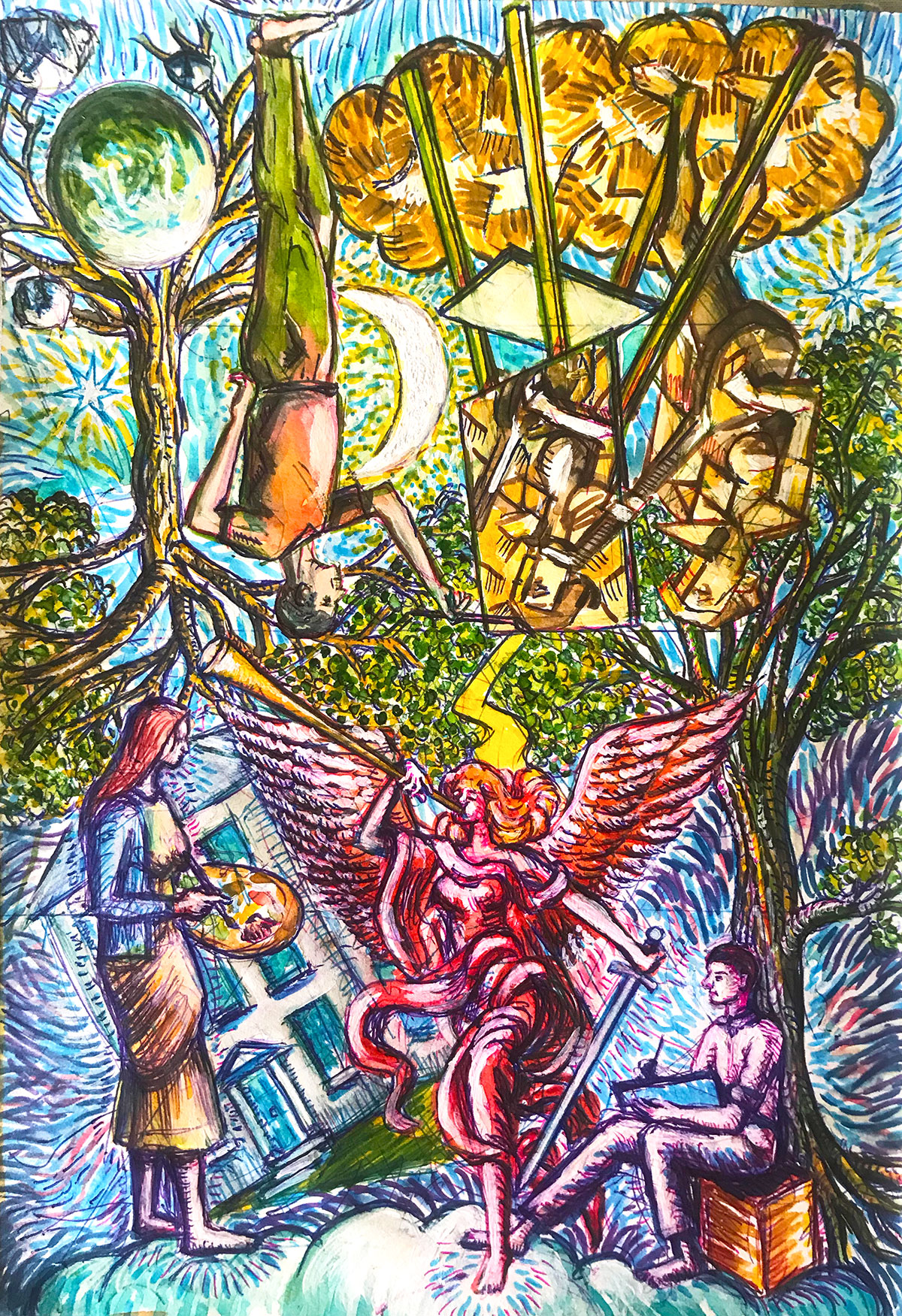 The Burglary When the Cubist Seers broke into the first mansion they caught a poor thief’s glimpse of reality. They spotted shards of absent light, dull grey brown, dim yellow and pit black edges of formless voids. They were spurred on by hoped for visions of spacetime, promised by Einstein. A multitude of confused distortions, a chair from every angle simultaneous. Infinite points of view redrawn in dirty black charcoal over and over itself. The front page of Le FiGaRo, perched haphazardly on the eternal threshold. A violin broken, disjointed, soundless. A mandolin non-played by the silent crouched musician, her features lost in an analytical phase. Unsure and misdirected she doesn’t play in the myriad dimensions propounded and bounced about. They were lost these burglars, in the lowest and darkest corner of the basement. But on the dusty footboards in the broken mirrored reflection of a shattered looking glass faintly, they thought they had joyfully discovered the lofty heights of sculpted plaster angels trumpeting from the rafters. They picked and barked their tune, believing it to be the primum mobile hymn of a new world disorder. Beyond the dingy dungeon they floated through, lay to them as yet an undiscovered bounty. The many shining sweetest coloured crystal light streams. Stained glass platonic solids of the boldest dreams. Vermillion, turquoise, lemon yellow, ultraviolet. Chandeliers of gathered moonbeams, oily auroras across the galaxy house glazing. As the star shot burst with asteroids of iridescent fountain pools. The traveller in this mansion spun past the ice blue and lime green seas of Venus. Along the intergalactic mind thread, inside the cosmic stellar line. Their view was not mine.