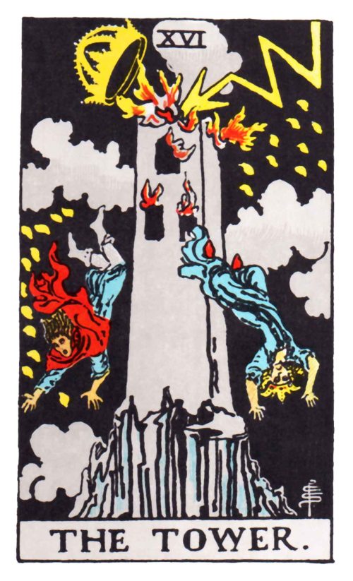 There are two figures falling from the tower one with a crown and another robed … important figure . This is very similar to the two main figures in the Dowth Legend The King and his Sorceress Sister. The tower in the Rider Waite Deck has a crown being blown off. In the tale, the tower was indeed commissioned by the king so it was the kings tower, hence the symbol of the crown being worked into the design of the roof.