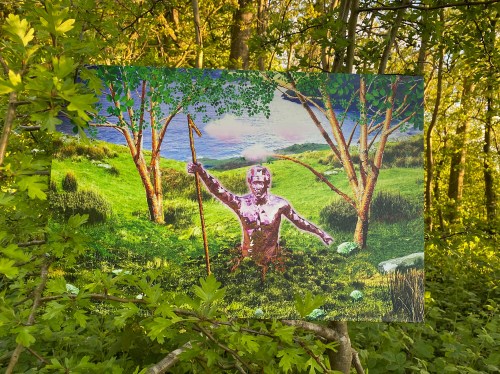At some time around 2017 I had had a dream of a man of glittering pink rose red crystal with a staff and a small turquoise water canteen carrying The water of Life who rose up through the ground as if being made in the earth or coming from beneath it. On the ground in the hedgerow were propped paintings showing the fields and the verges which he traversed. A sacred branch lay along the path he tread . He was shining and bright. Happy and determined, he was hardened by the rebirth, made anew. This felt like where he should be. He could now do more and make more progress. He loved walking the fields and the undiscovered landscape. He strode forward. The paintings around him were other scenes from his journey.