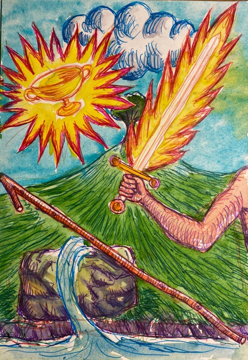 The Dagda carried the bottomless un-dry cauldron known as the “Coire Ainsic”. Any one who came to it never left unsatisfied. The good god Dagda (which is what his name means ) who is also known as Eoachaid Ollathair (Horseman , All- Father ) himself was portrayed not unlike The Fool in the Tarot Deck with a tunic that barely covered his exterior leaving his behind exposed and carrying a club or stick (or rudely dragging his huge penis along the ground) . But this is not consistent with his image as also the cultured player of the “Uaithne” the oak harp that he carried with him to call forth the seasons or the order of battle . The Morrigen was known as his “envious wife” and one of his daughter’s was Brigid a name which was later christianised to become St Brigid whose feast day is the first day of spring, February the first . His image was tampered with by christian translators. He appeared on the face of it to be a primitive but happy fellow but he is associated with giving life and sustenance and was for a time in the tales the most important God until he was replaced by Dalbáeth (enchanted Fire ) who’s daughters Eriú, Banba and Foladh The Triple Goddess’s came to rule Ireland with one of them giving Ireland its modern day Irish name.